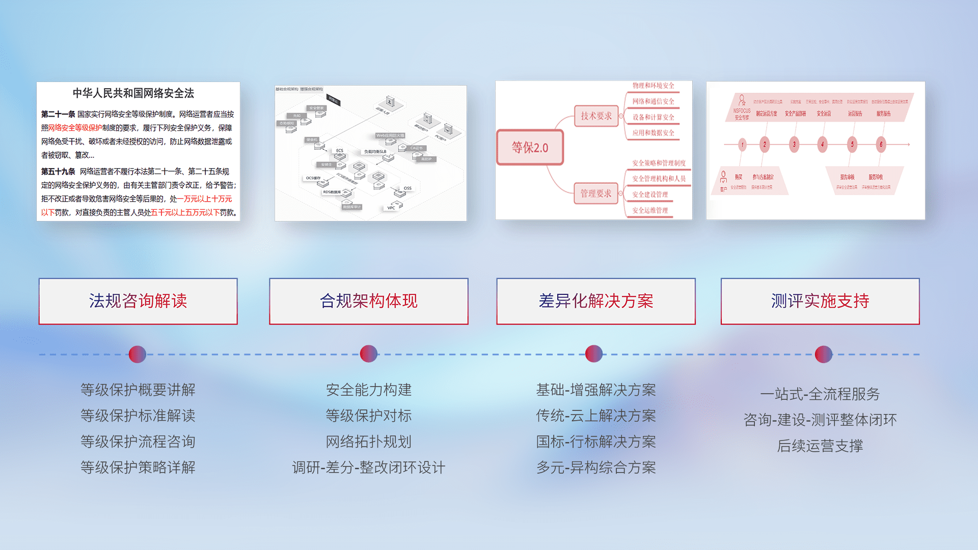 通过专业的法律咨询解读、、合规架构体现、、、差异化解决方案、、、、测试实施支持等服务,,为客户量身打造等保合规体系。。。。